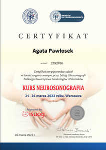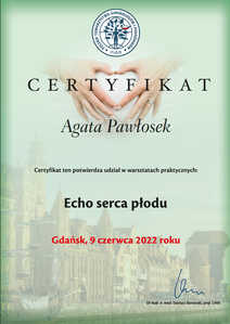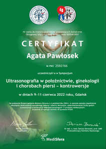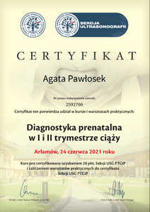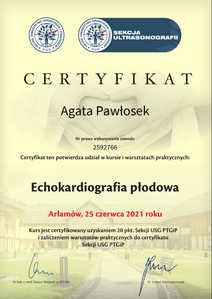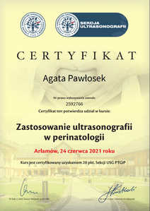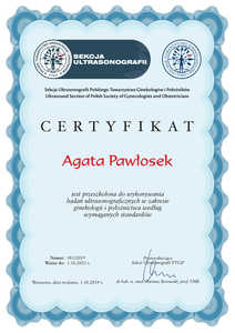 - Certyfikat Sekcji Ultrasonografii Polskiego Towarzystwa Ginekologów i Położników (Numer: 181/2019),