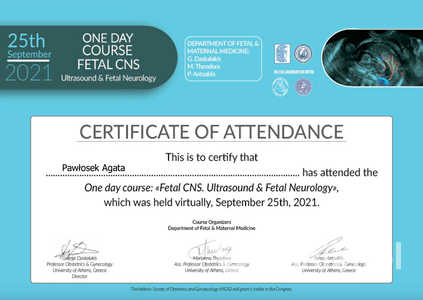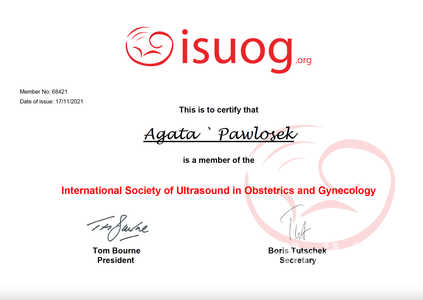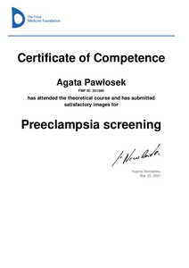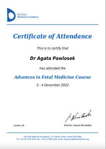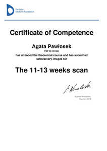 - Certyfikat potwierdzający umiejętności w zakresie wykonywania badań prenatalnych Fetal Medicine Foundation (FMF ID:201560),