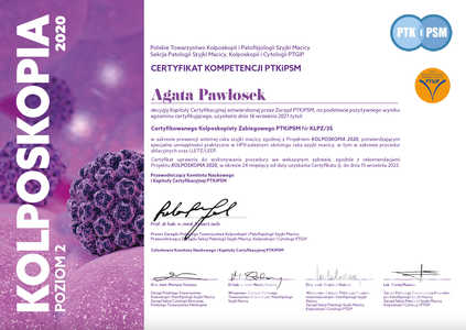 - Certyfikaty Polskiego Towarzystwa Kolposkopii i Patofizjologii Szyjki Macicy potwierdzające wiedzę i umiejętności w zakresie prewencji wtórnej raka szyjki macicy w tym w HPV-zależnym modelu skriningu, w zakresie wykonywania badań kolposkopowych (KLP/45) oraz zabiegów na szyjce macicy takich jak LEEP/LLETZ (KLPZ/35).
