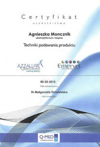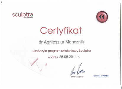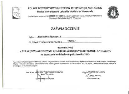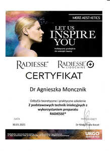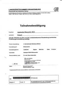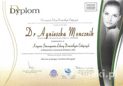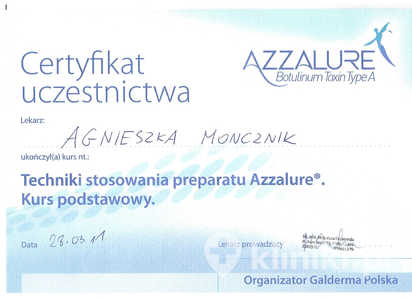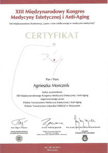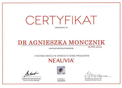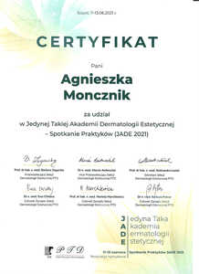 Lista 10 certyfikatów otrzymanych przez lek. Agnieszka Moncznik, potwierdzające kwalifikacje specjalisty.
