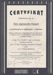 Lista 3 certyfikatów otrzymanych przez dr n. med. Agnieszka Nowak, potwierdzające kwalifikacje specjalisty.