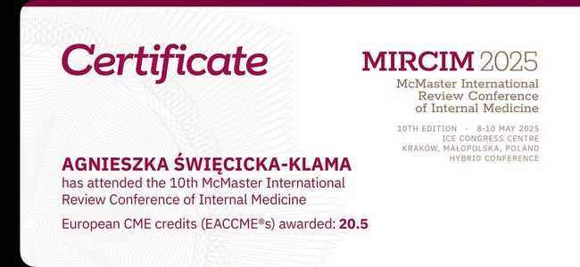 - certyfikat potwierdzający udział w "McMaster International Review Conference od Internal Medicine".