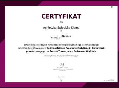 - wstępny kurs profesjonalnego leczenia nadwagi i otyłości w ramach Ogólnopolskiego Programu Certyfikacji i Akredytacji prowadzonego przez Polskie Towarzystwo Badań nad Otyłością,