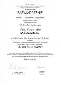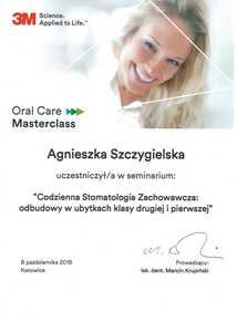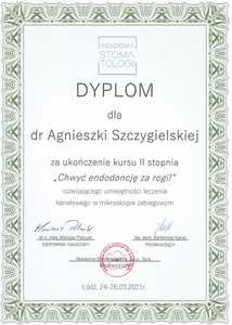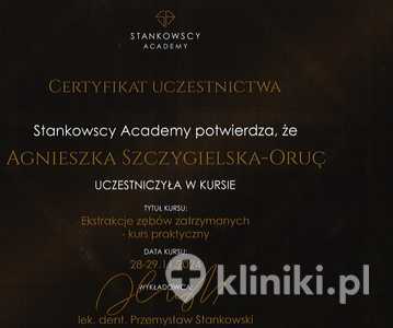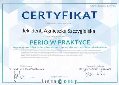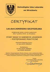 Lista 6 certyfikatów otrzymanych przez lek. dent. Agnieszka Szczygielska, potwierdzające kwalifikacje specjalisty.