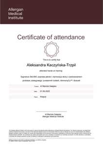 Lista 1 certyfikatów otrzymanych przez lek. Aleksandra Kaczyńska-Trzpil, potwierdzające kwalifikacje specjalisty.