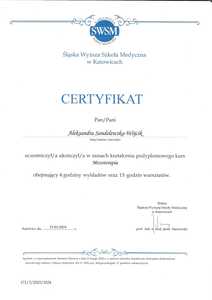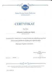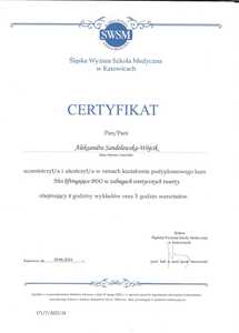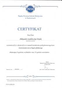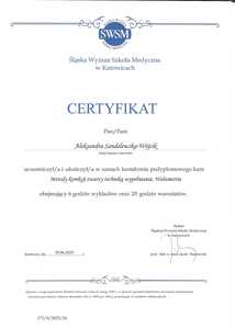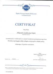 Lista 19 certyfikatów otrzymanych przez lek. Aleksandra Sandelewska-Wójcik, potwierdzające kwalifikacje specjalisty.