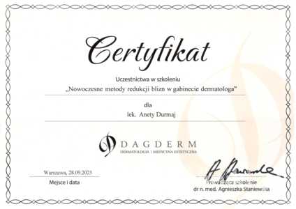 Lista 1 certyfikatów otrzymanych przez lek. Aneta Durmaj, potwierdzające kwalifikacje specjalisty.