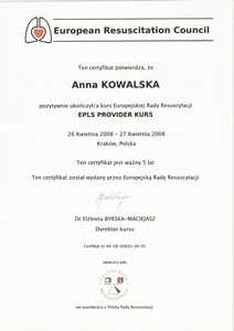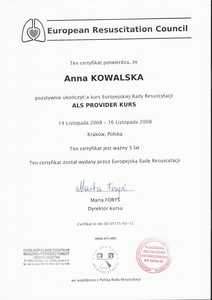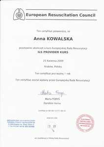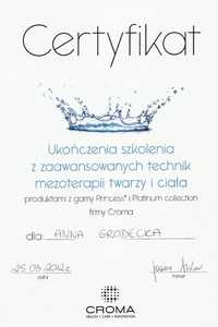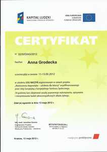 Lista 19 certyfikatów otrzymanych przez lek. Anna Grodecka, potwierdzające kwalifikacje specjalisty.