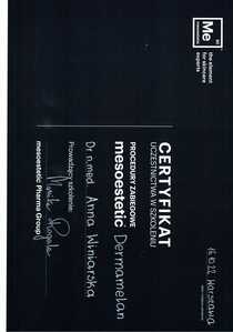 Lista 1 certyfikatów otrzymanych przez dr n. med. Anna Winiarska, potwierdzające kwalifikacje specjalisty.