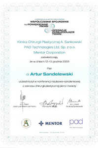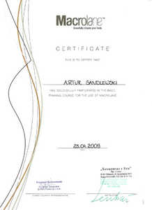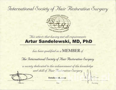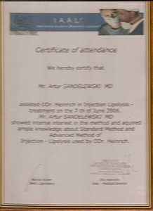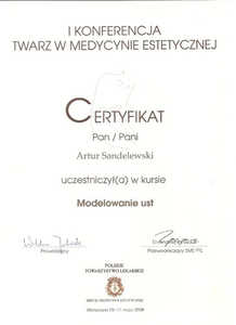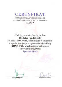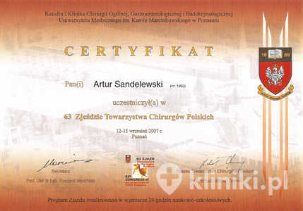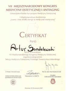 Lista 22 certyfikatów otrzymanych przez dr n. med. Artur Sandelewski, potwierdzające kwalifikacje specjalisty.