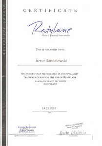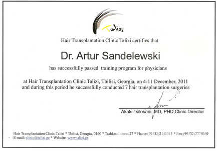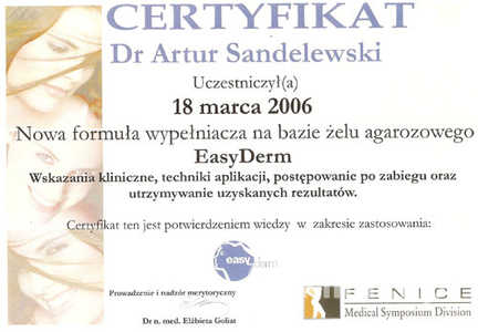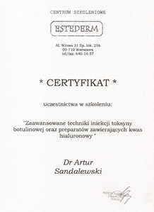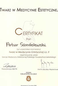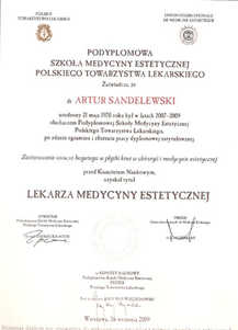 Dbając o komfort pacjentów, dr Sandelewski regularnie doskonali swoje umiejętności poprzez uczestnictwo w wielu specjalistycznych kursach w kraju i za granicą. Między innymi, w Mediolanie przeszedł kurs z zakresu zastosowania toksyny botulinowej u dr Alessio Redaelli, eksperta w tej dziedzinie. Uczył się również w Wiedniu u dr Heinricha, dyrektora International Academy of Aesthetic Lipolysis, który przekazał mu wiedzę na temat lipolizy. Od kilku lat dr Sandelewski poświęca się także poznawaniu tajników chirurgii odtwórczej – przechodzi kolejne kursy z zakresu transplantacji włosów. Uczył się u najlepszych specjalistów w dziedzinie przeszczepów włosów, odbywając szkolenia hands-on w renomowanych zagranicznych ośrodkach. Wiedzę zdobywał, między innymi, u dr Vinzenzo Gambino, dyrektora Hair Restoration Surgery San Raffaele University Hospital Milan, uczył go również dr Akaki Tsilosani z Hair Transplantation Clinic Talizi w Tbilisi. Specjalista posiada także certyfikat IHSMC (International Hair Surgery Master Course), zdobyty w 2011 roku w Paryżu.