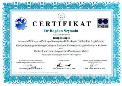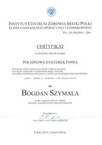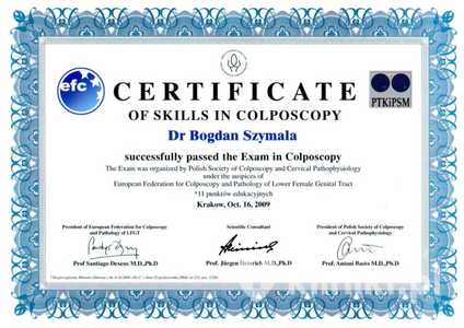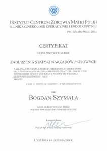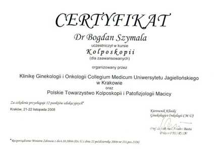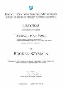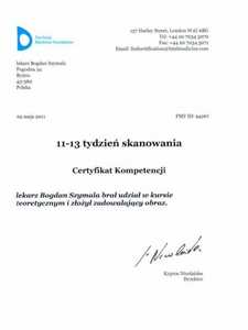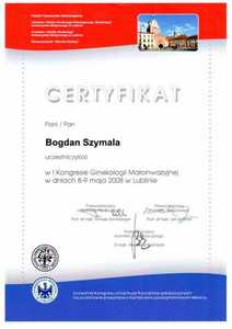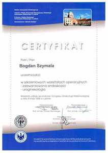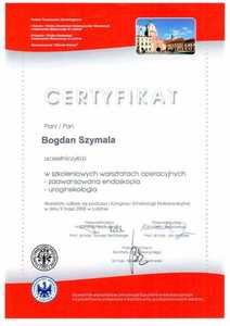 Lista 16 certyfikatów otrzymanych przez dr n. med. Bogdan Szymala, potwierdzające kwalifikacje specjalisty.