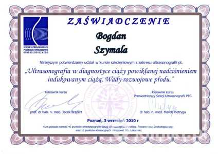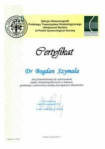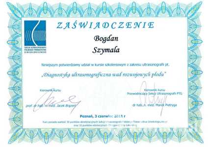 Posiada wiele certyfikatów potwierdzających umiejętności zdobyte na profesjonalnych szkoleniach. Pogłębiał swoją wiedzę w dziedzinie ultrasonografii diagnostycznej w trakcie licznych kursów takich jak m.in. szkolenie: "Ultrasonografia w diagnostyce ciąży powikłanej nadciśnieniem indukowanym ciążą. Wady rozwojowe płodu" oraz "Diagnostyka ultrasonograficzna wad rozwojowych płodu". Uzyskał również Certyfikat podstawowy sekcji USG Polskiego Towarzystwa Ginekologicznego.