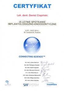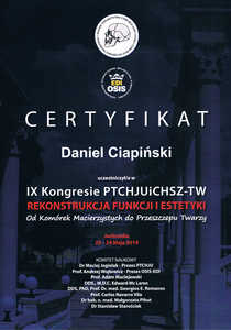 Lista 9 certyfikatów otrzymanych przez dr n. med. Daniel Ciapiński, potwierdzające kwalifikacje specjalisty.