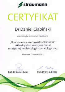 Dr n. med. Daniel Ciapiński przeprowadza liczne zabiegi stomatologiczne, przede wszystkim z zakresu implantologii. Prowadzi konsultacje protetyczne i implantologiczne, a przy pomocy różnorodnych uzupełnień protetycznych (korona porcelanowa pełnoceramiczna na implantach, korony i mosty porcelanowe na metalu, protezy stałe i ruchome) pomaga pacjentom pozbyć się braków zębowych od pojedynczych ubytków aż do całkowitego bezzębia. Przeprowadza również zabiegi w ramach chirurgii stomatologicznej, usuwa zęby zatrzymane, wykonuje resekcje i hemisekcje, a także odbudowuje ubytki kostne materiałami kościozastępczymi. W obszarze szczególnych zainteresowań dra znajduje się również regeneracja tkanek w obrębie jamy ustnej.