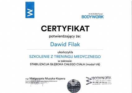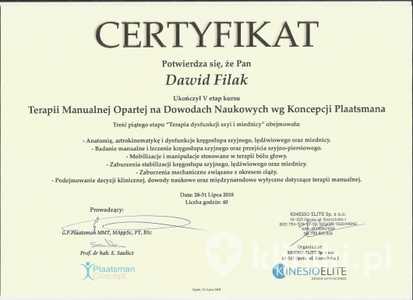 Lista 5 certyfikatów otrzymanych przez mgr Dawid Filak, potwierdzające kwalifikacje specjalisty.