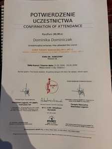 Lista 4 certyfikatów otrzymanych przez mgr Dominika Dominiczak, potwierdzające kwalifikacje specjalisty.