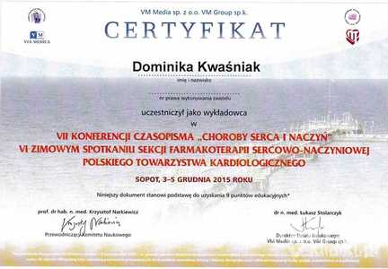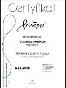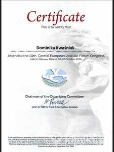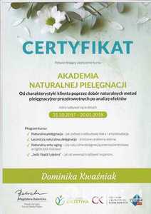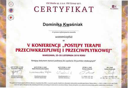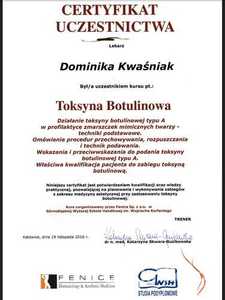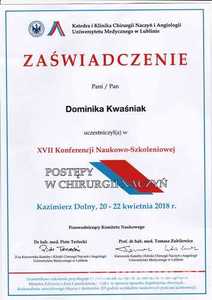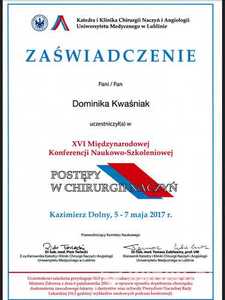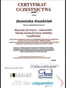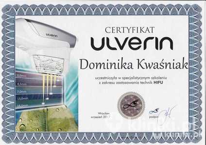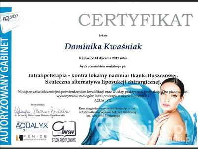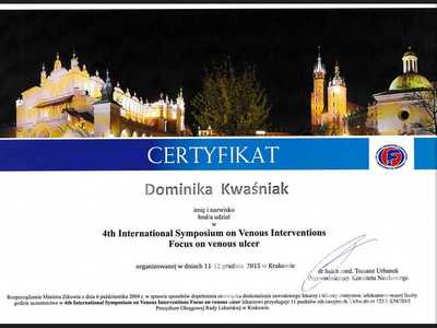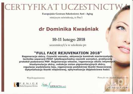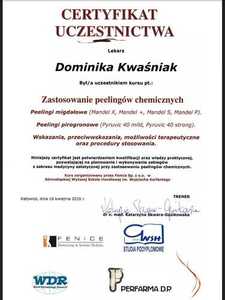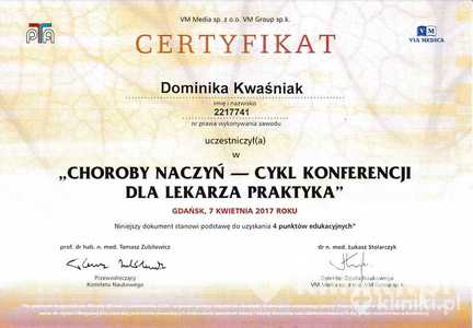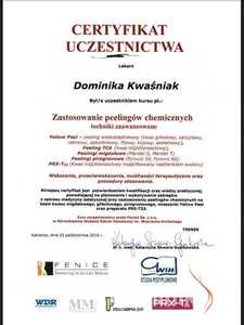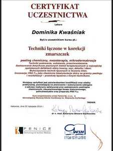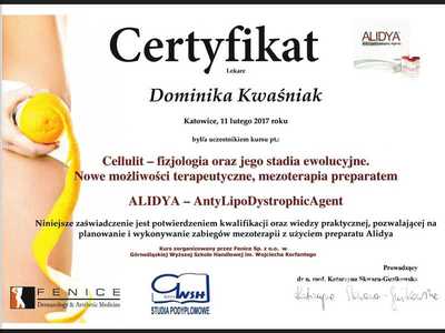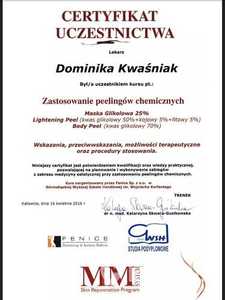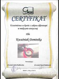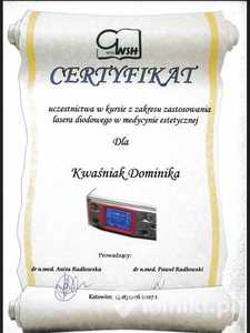 Lista 32 certyfikatów otrzymanych przez lek. Dominika Kwaśniak, potwierdzające kwalifikacje specjalisty.