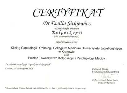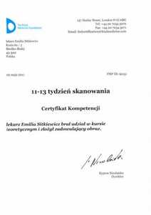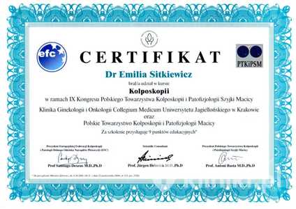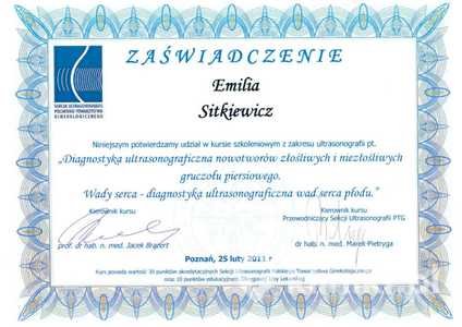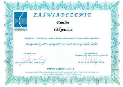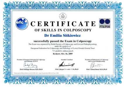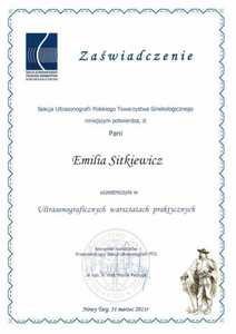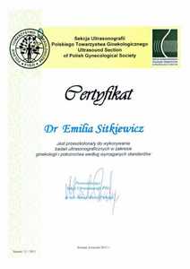 Jest posiadaczką wielu certyfikatów potwierdzających ukończone szkolenia, m.in. Certyfikatu badań prenatalnych USG Polskiego Towarzystwa Ginekologicznego, Certyfikatu Fetal Medicine Foundation w zakresie diagnostyki prenatalnej: NT (przezierności karkowej), NB (kości nosowej), DV (przepływu w przewodzie żylnym), TV (przepływu w zastawce trójdzielnej w sercu) oraz Europejskiego Certyfikatu Umiejętności w zakresie badań kolposkopowych.