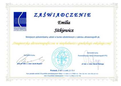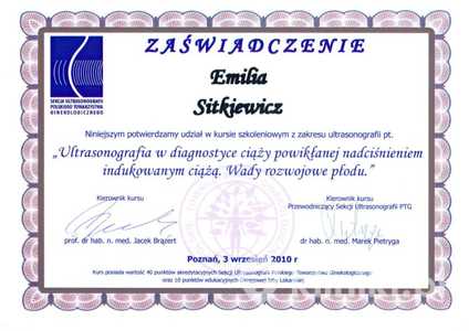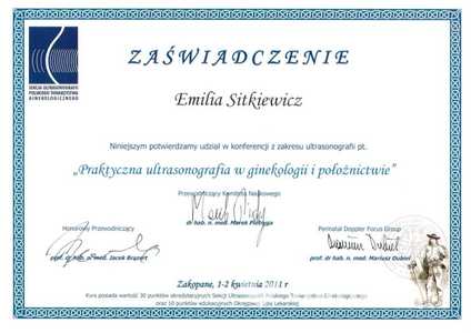 Lek. med. Emilia Sitkiewicz w swojej codziennej praktyce lekarskiej zajmuje się przeprowadzaniem badań prenatalnych płodu, a także badań ultrasonograficznych wykonywanych w diagnostyce niepłodności oraz chorobach nowotworowych. Udziela porad i konsultacji ginekologicznych oraz wykonuje zabiegi kolposkopii.