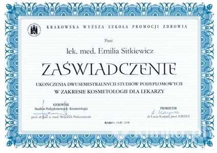 Nieustannie doskonali swoje umiejętności, a także poszerza krąg zainteresowań medycznych. Ukończyła studia podyplomowe dla lekarzy w zakresie kosmetologii w Wyższej Szkole Promocji Zdrowia w Krakowie.