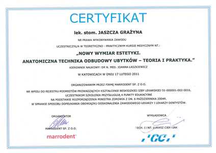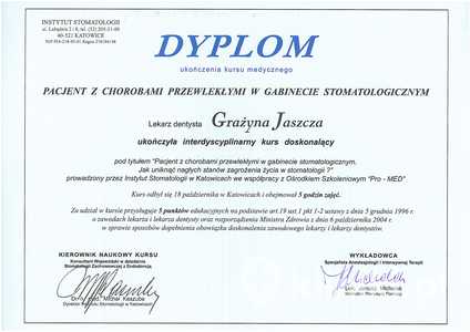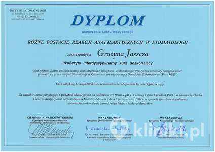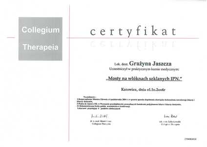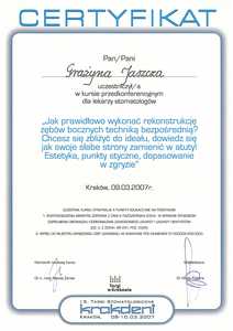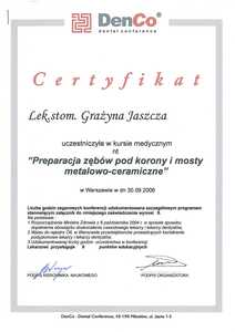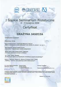 Lista 10 certyfikatów otrzymanych przez lek. stom. Grażyna Jaszcza, potwierdzające kwalifikacje specjalisty.