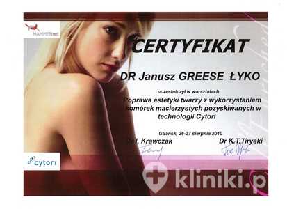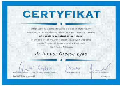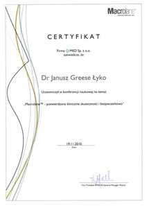 Lista 7 certyfikatów otrzymanych przez lek. Janusz Greese-Łyko, potwierdzające kwalifikacje specjalisty.
