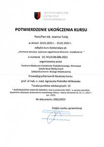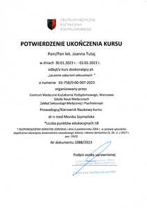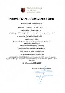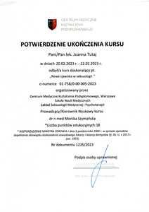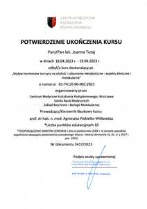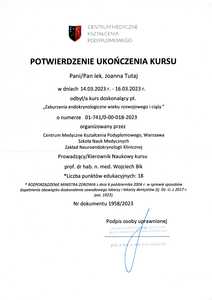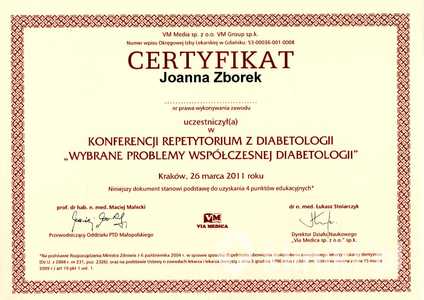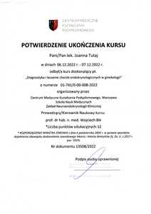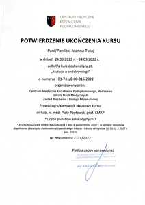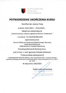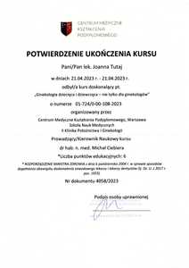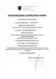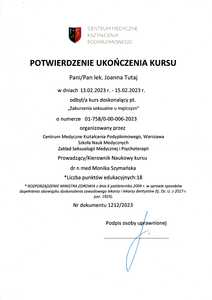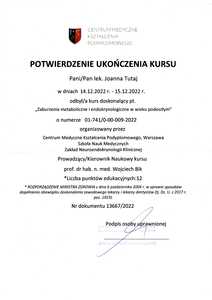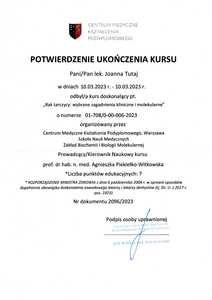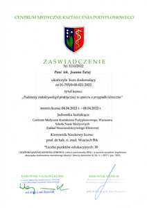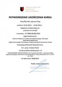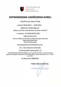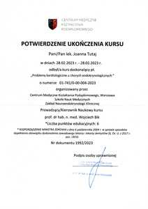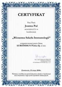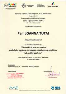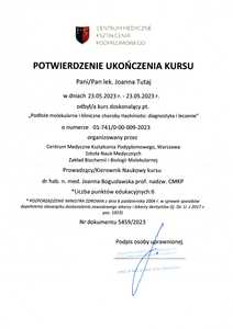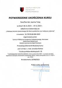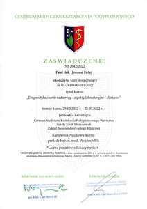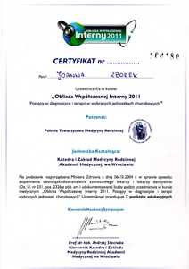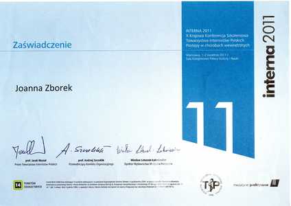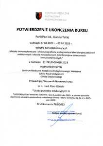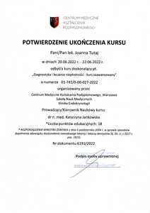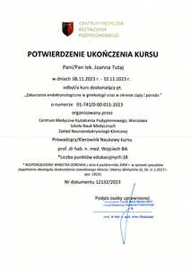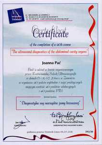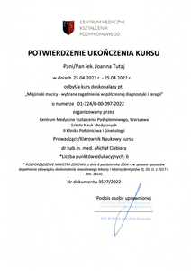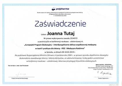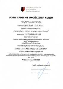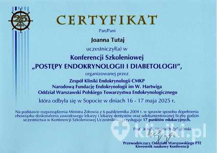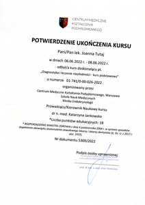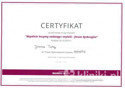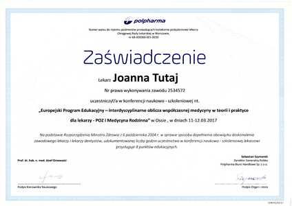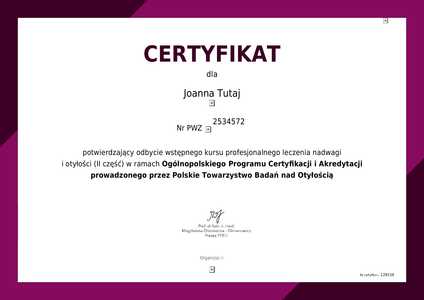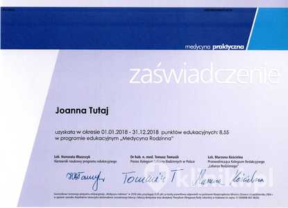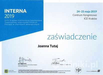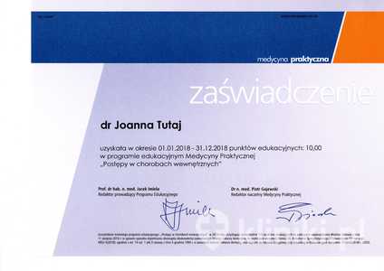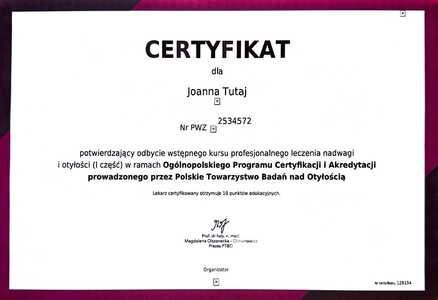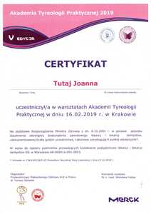 Lista 50 certyfikatów otrzymanych przez lek. Joanna Tutaj, potwierdzające kwalifikacje specjalisty.