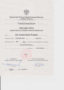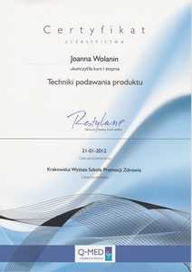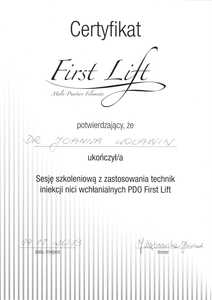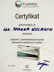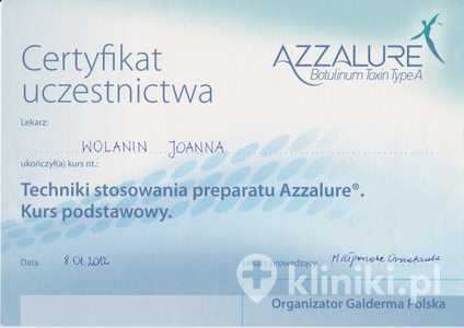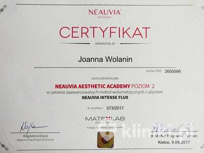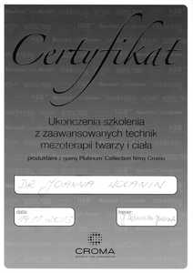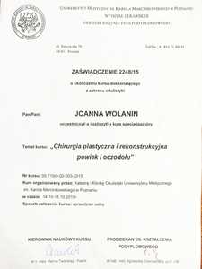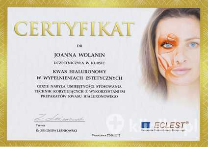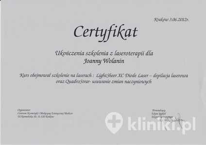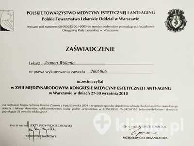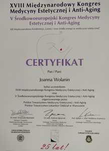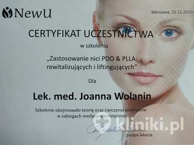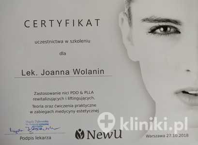 Lista 16 certyfikatów otrzymanych przez lek. Joanna Wolanin, potwierdzające kwalifikacje specjalisty.