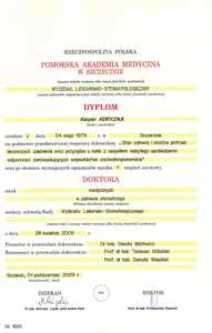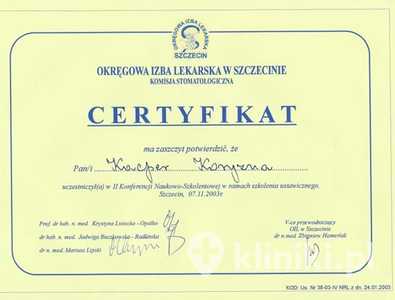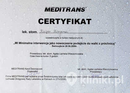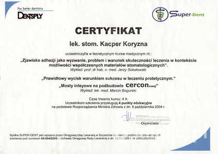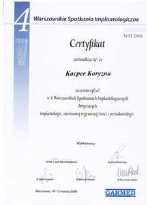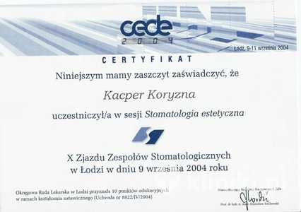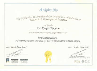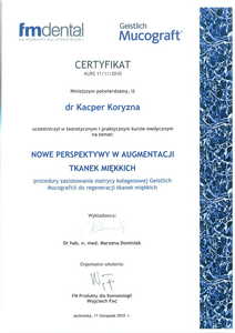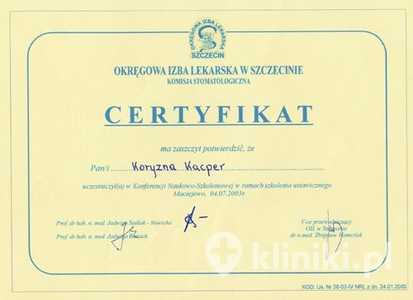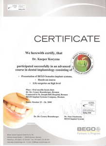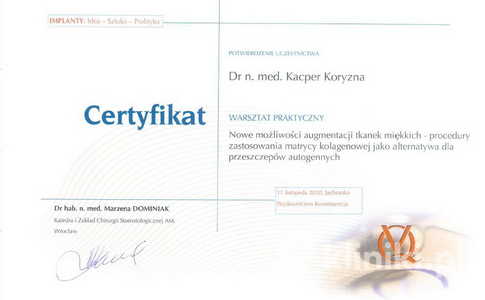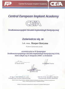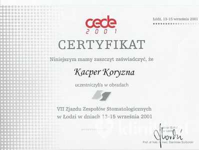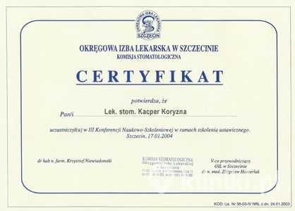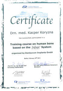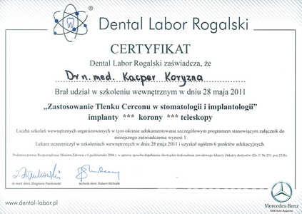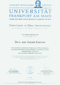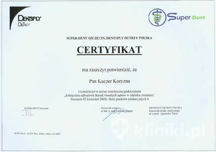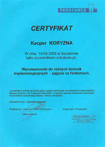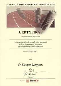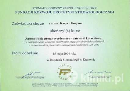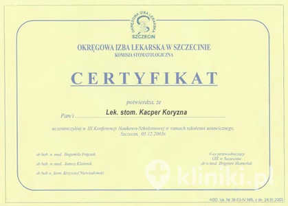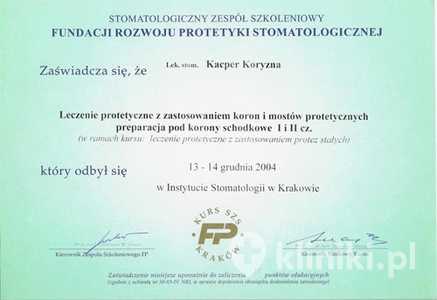 Dr n. med. M. Sc. Master of Oral Implantology Kacper Koryzna jest stomatologiem z wieloletnim doświadczeniem zawodowym, wybitnym specjalistą w zakresie implantologii. Uprawnienia do wykonywania zawodu uzyskał w 2003 roku, a w 2009 roku na Wydziale Lekarsko-Dentystycznym Pomorskiej Akademii Medycznej w Szczecinie obronił dysertację doktorską „Stan zdrowia i analiza potrzeb leczniczych uzębienia oraz przyzębia u osób z zespołem nabytego upośledzenia odporności zamieszkujących województwo zachodniopomorskie” i uzyskał tytuł doktora nauk medycznych. W roku 2010 ukończył prestiżowe Curriculum Implantologiczne na Uniwersytecie im. J.W. Goethego we Frankfurcie nad Menem, a w 2013 roku uzyskał najwyższy światowy tytuł w zakresie implantologii stomatologicznej – „Master od Science of Oral Implantology”, również we Frankfurcie. Tytuł ten przyznawany jest najlepszym światowym implantologom, którzy mogą poszczycić się wybitną wiedzą w zakresie implantologii stomatologicznej oraz bogatym doświadczeniem w tym zakresie. Tym samym dr Koryzna dołączył do grona zaledwie piętnastu polskich implantologów, posiadających ten prestiżowy tytuł.