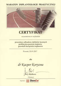 Dr n. med. Kacper Koryzna specjalizuje się w zabiegach z zakresu implantologii i chirurgii stomatologicznej. Przy pomocy nowoczesnych systemów implantologicznych zupełnia braki zębowe od pojedynczych zębów aż do całkowitego bezzębia, pozwalając pacjentom w sposób szybki i bezpieczny odzyskać piękny uśmiech. Oprócz wprowadzania implantów zajmuje się także przygotowaniem szczęki do zabiegu: przeprowadza zabiegi podnoszenia dna zatoki szczękowej metodą otwartą i zamkniętą, zajmuje się również sterowaną regeneracją kości oraz przeszczepami kości. Dr Koryzna wykonuje także zabiegi z zakresu protetyki i periodontologii: swoim pacjentom oferuje korony i mosty na implantach, a także pełnoceramiczne i na podbudowie złotej lub metalowej oraz szeroki wybór protez. W trosce o pełen komfort pacjentów oraz doskonałe efekty zabiegów, w trakcie swojej pracy dr Koryzna korzysta z nowoczesnego sprzętu oraz stosuje sprawdzone materiały wiodących producentów.