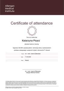 Lista 1 certyfikatów otrzymanych przez lek. Katarzyna Pisarz, potwierdzające kwalifikacje specjalisty.