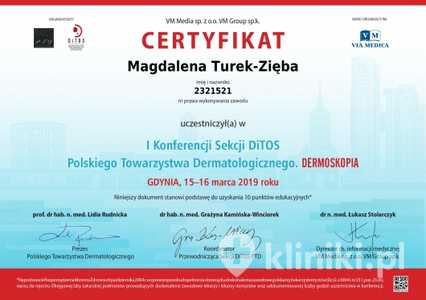 Lista 1 certyfikatów otrzymanych przez lek. Magdalena Turek-Zięba, potwierdzające kwalifikacje specjalisty.