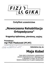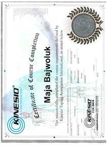 Lista 7 certyfikatów otrzymanych przez mgr Maja Kobel, potwierdzające kwalifikacje specjalisty.