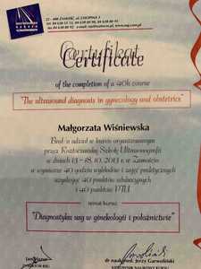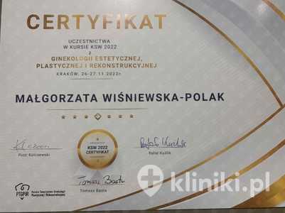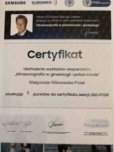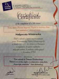 Lista 9 certyfikatów otrzymanych przez lek. Małgorzata Wiśniewska-Polak, potwierdzające kwalifikacje specjalisty.