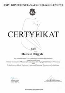 Lista 11 certyfikatów otrzymanych przez dr n. med. Mateusz Dzięgała, potwierdzające kwalifikacje specjalisty.