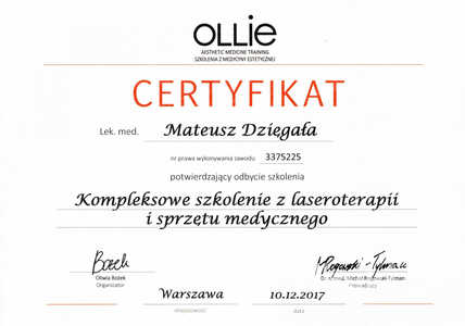 Dr n. med. Mateusz Dzięgała jest specjalistą urologiem z prestiżowym dyplomem FEBU (Fellow of the European Board of Urology) oraz dyplomowanym lekarzem medycyny estetycznej PTL (Polskiego Towarzystwa Lekarskiego). Z wykształcenia jest również mgr biologii molekularnej.