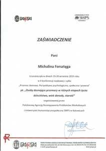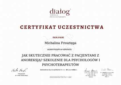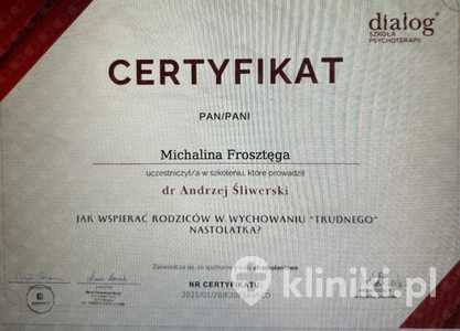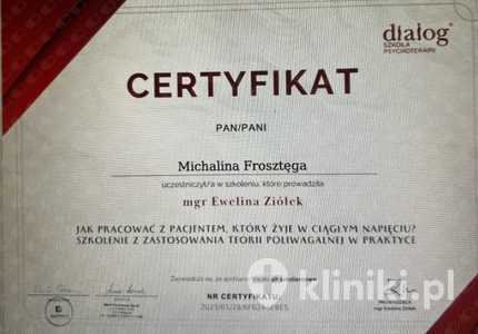 Lista 6 certyfikatów otrzymanych przez mgr Michalina Frosztęga, potwierdzające kwalifikacje specjalisty.