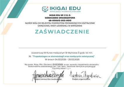 Konsultacja w zakresie medycyny estetycznej100 złKonsultacja z zakresu medycyny anty-aging100 złCertyfikaty