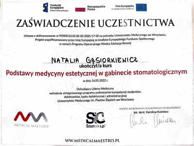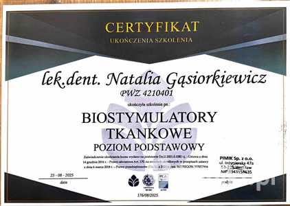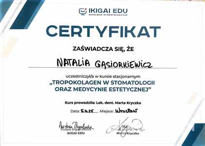 Lista 8 certyfikatów otrzymanych przez lek. dent. Natalia Gąsiorkiewicz, potwierdzające kwalifikacje specjalisty.