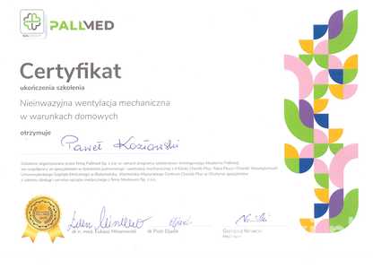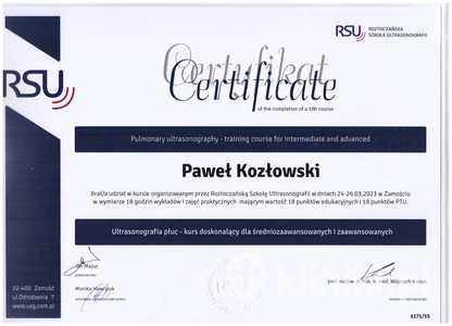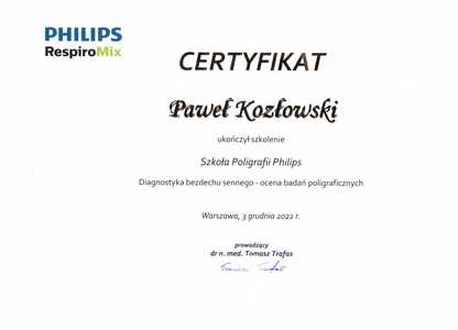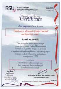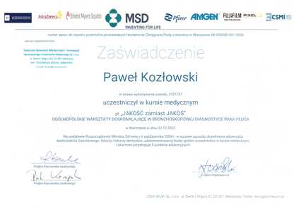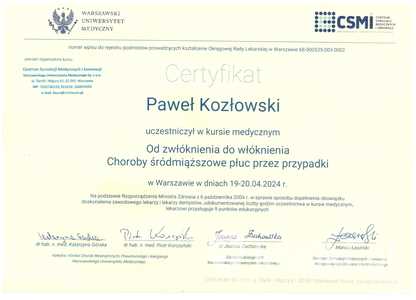 Lista 6 certyfikatów otrzymanych przez lek. Paweł Kozłowski, potwierdzające kwalifikacje specjalisty.