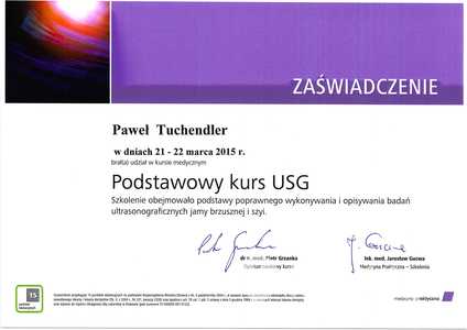 Lek. Paweł Tuchendler jest młodym i ambitnym lekarzem, który dyplom i uprawnienia lekarza uzyskał po ukończeniu Wydziału Wojskowo-Lekarskiego na Uniwersytecie Medycznym w Łodzi 2013 roku. Doświadczenie i kwalifikacje zawodowe zdobywa w Oddziale Chirurgii Onkologicznej II Dolnośląskiego Centrum Onkologii oraz w Klinice Chirurgii Małoinwazyjnej i Proktologicznej Uniwersyteckiego Szpitala Klinicznego we Wrocławiu. Pracował też jako lekarz pogotowia ratunkowego. Doktor Tuchendler regularnie bierze udział w kursach doskonalących oraz konferencjach medycznych.