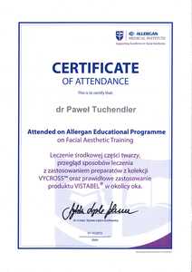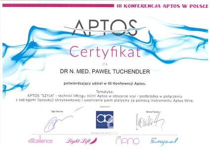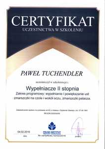 Lista 8 certyfikatów otrzymanych przez lek. Paweł Tuchendler, potwierdzające kwalifikacje specjalisty.