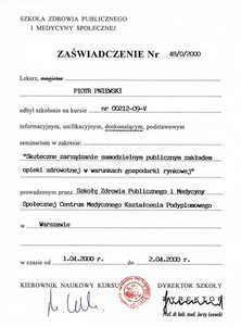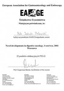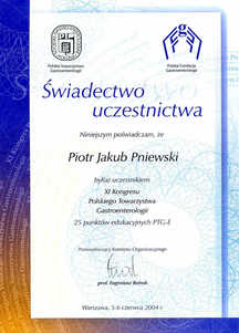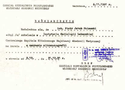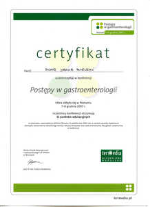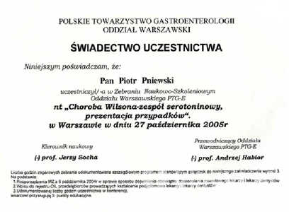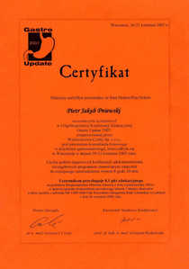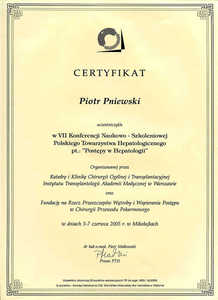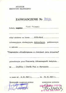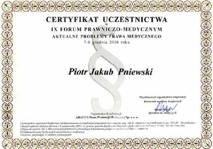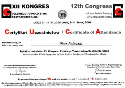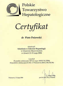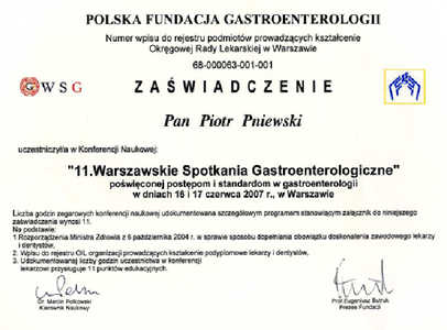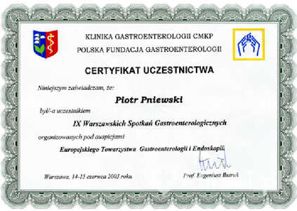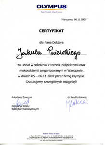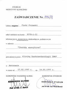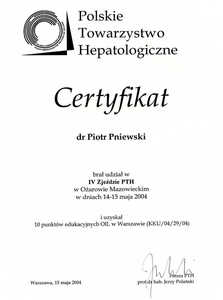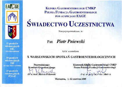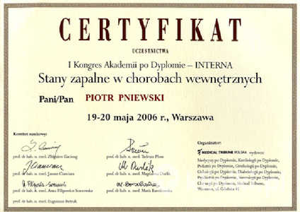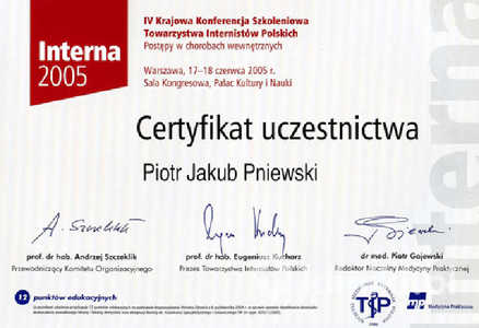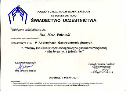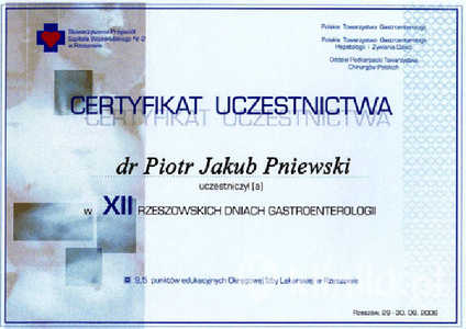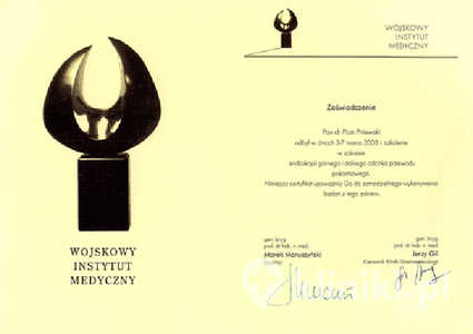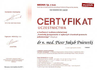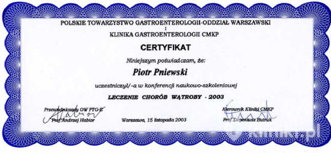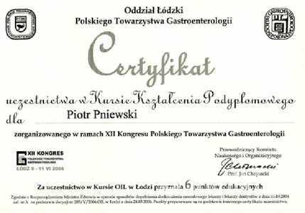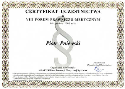 Lista 47 certyfikatów otrzymanych przez lek. Piotr Pniewski, potwierdzające kwalifikacje specjalisty.