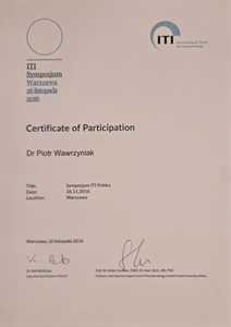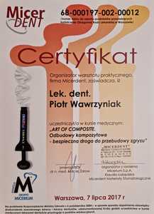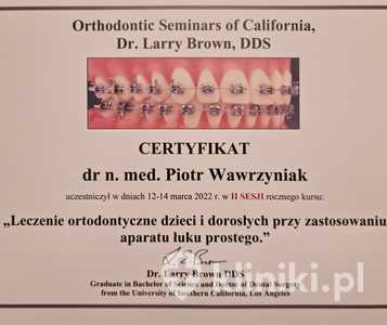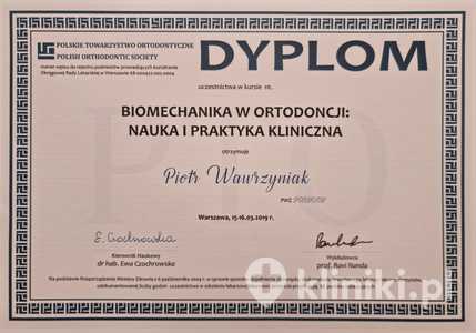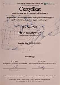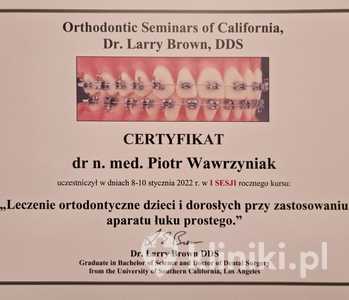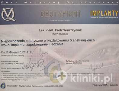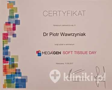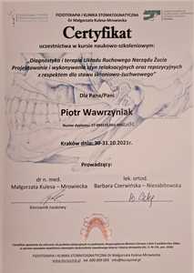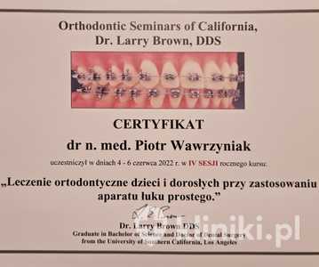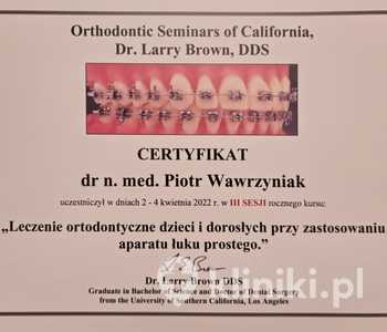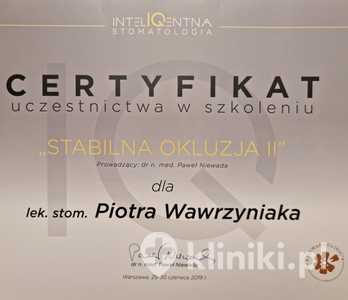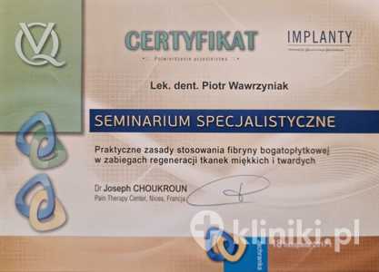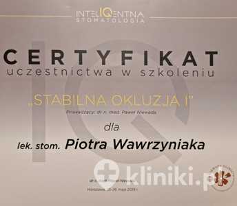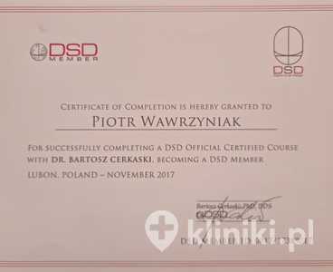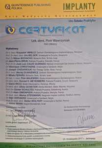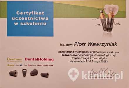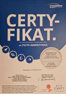 Lista 21 certyfikatów otrzymanych przez dr n. med. Piotr Wawrzyniak, potwierdzające kwalifikacje specjalisty.