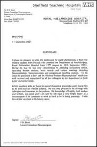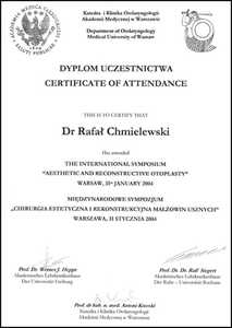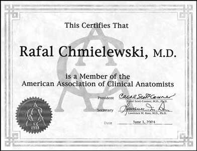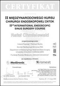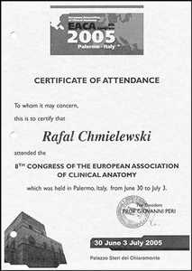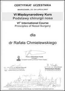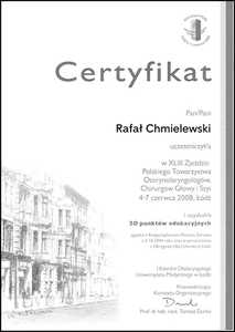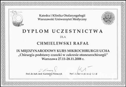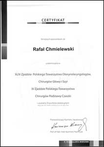 Lista 19 certyfikatów otrzymanych przez lek. Rafał Chmielewski, potwierdzające kwalifikacje specjalisty.