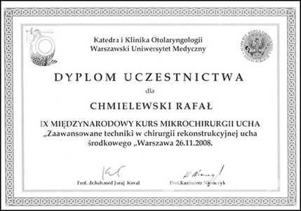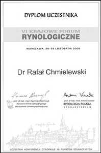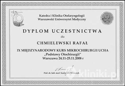 Dr Rafał Chmielewski to specjalista z zakresu otorynolaryngologii, chirurgii głowy i szyi. Doświadczenie zawodowe zdobywał w Klinice Otorynolaryngologii Warszawskiego Uniwersytetu Medycznego oraz na Oddziale Laryngologii w szpitalu wojewódzkim w Siedlcach. Od 2002 do 2011 roku prowadził wykłady i ćwiczenia z anatomii prawidłowej człowieka w Zakładzie Anatomii Prawidłowej i Klinicznej Centrum Biostruktury Warszawskiego Uniwersytetu Medycznego. Podczas stażu na Amerykańskim Karaibskim Uniwersytecie Medycznym na wyspie Św. Marcina nie tylko zdobywał wiedzę, ale również prowadził wykłady i ćwiczenia prosektoryjne z anatomii człowieka dla studentów wydziału lekarskiego.