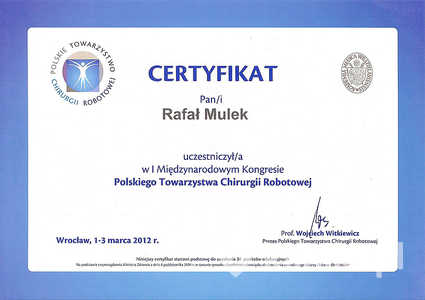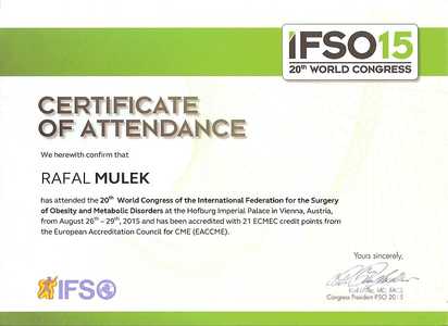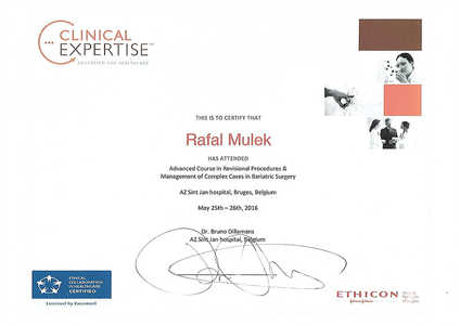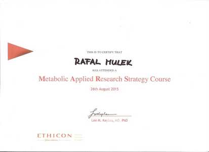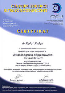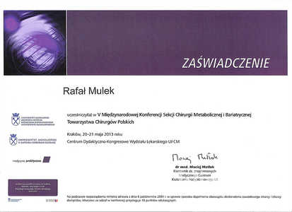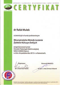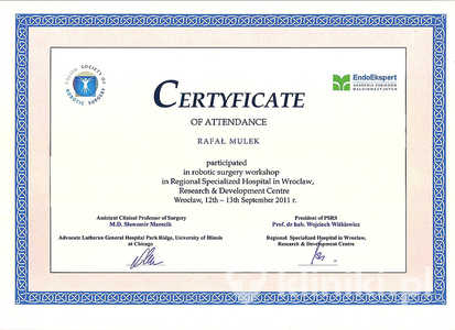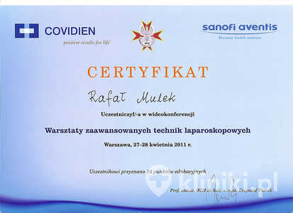 Lista 21 certyfikatów otrzymanych przez lek. Rafał Mulek, potwierdzające kwalifikacje specjalisty.
