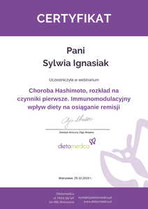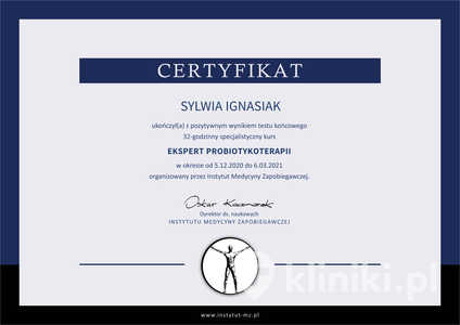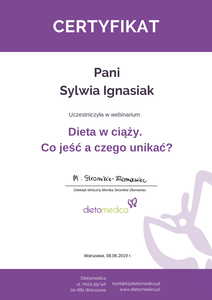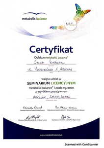 Analiza składu ciałapomiar profesjonalną wagą TANITA + pomiary antropometryczne i analiza wyników100 złIndywidualny plan żywieniowy - 7 dnijadłospis tygodniowy z zaleceniami żywieniowymi i z suplementacją150 złIndywidualny plan żywieniowy - 14 dnijadłospis 2-tygodniowy z zaleceniami żywieniowymi i z suplementacją250 złCertyfikaty