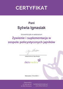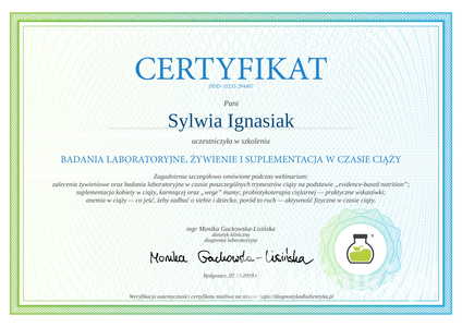 Konferencja Instytutu Medycyny Zapobiegawczej; „Odporność pochodzi z brzucha”, szkolenia: „Badania Laboratoryjne, Żywienie i Suplementacja w czasie ciąży”, „Dieta w, ciąży, co jeść a czego unikać” „Choroba Hashimoto, rozkład na czynniki pierwsze. Immunomodulacyjny wpływ diety na osiąganie remisji.” „Żywienie i suplementacja w zespole policystycznych jajników” „Dieta ketogeniczna od podstaw” „Czym jest SIBO? Jak go diagnozować, leczyć i zapobiegać nawrotom’ „Diagnostyka i dietoterapia chorób skóry” „Diagnostyka laboratoryjna w nieswoistych chorobach zapalnych jelit’ „Dieta w zespole jelita nadwrażliwego. Co pomaga w świetle badań” „Żywieniowe podejście do leczenia trądziku”